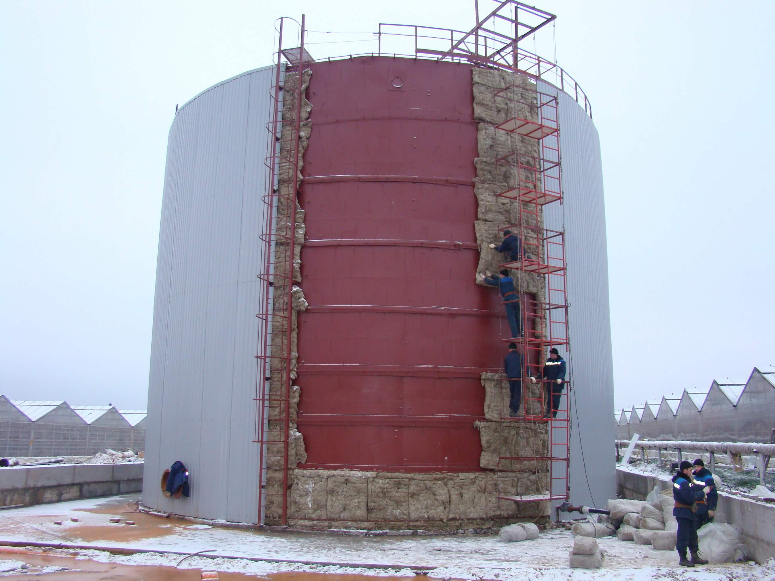 Накопительные резервуары для горячей воды изготавливаются по аналогии с обыкновенными бойлерами. Основная емкость выполнена из металла определенной толщины, что гарантирует прочность и требуемый объем. В зависимости от предназначения бак может быть с подогревом и без. Номинальный объем варьируется в пределах 100-1000 литров. Однако нередко резервуары-аккумуляторы изготавливаются по заказным проектам. Внутри бака присутствуют специальные каналы в форме спирали, которые способствуют правильному распределению тепла при наполнении емкости. Также резервуар имеет вход и выход для подключения. Наружная часть окрашена специальным антикоррозийным составом и утеплена слоем утеплителя. Помимо этого наш завод производит резервуары и силосы цемента, мела, гипсового порошка, зерна и др.